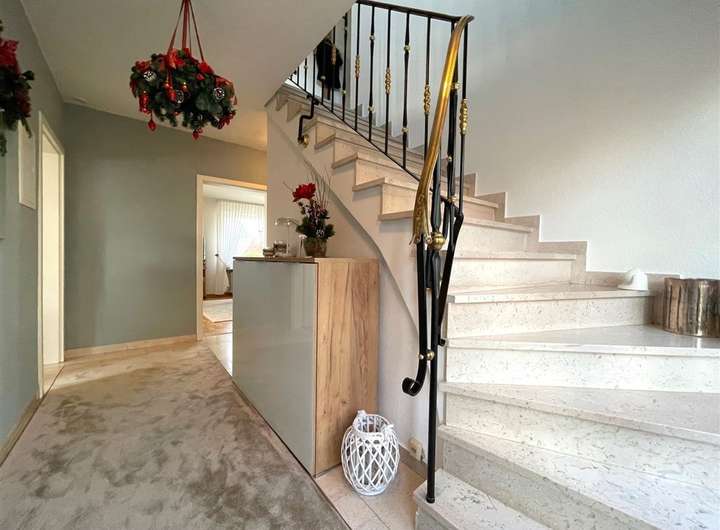 Der Grundriss des Hauses ist gut durchdacht, funktional gestaltet und bietet viel Platz für die ganze Familie. Zum Eingang geht man einige Stufen, so dass das EG im Hochparterre liegt. Die Immobilie begeistert im ersten Eindruck durch ein sehr gelungenes Entrée mit großer Hauseingangstür, hochwertigen Natursteinfliesen am Boden sowie auf der geschwungenen Treppe in die Geschosse. In den weiteren Wohn- und Schlafräumen ist edles Holz-Parkett verlegt. Weiße Kassetten-Holztüren unterstreichen den modernen und geschmackvollen Gesamteindruck.
