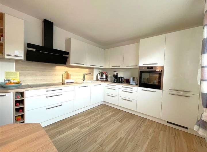 Die luxuriöse, drei Jahre alte Einbauküche in weiß-hochglanz ist mit Markengeräten von NEFF und Miele ausgestattet und besticht durch ihre Eleganz. Der Raum bietet Platz für eine Sitzgelegenheit.