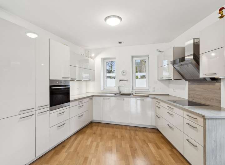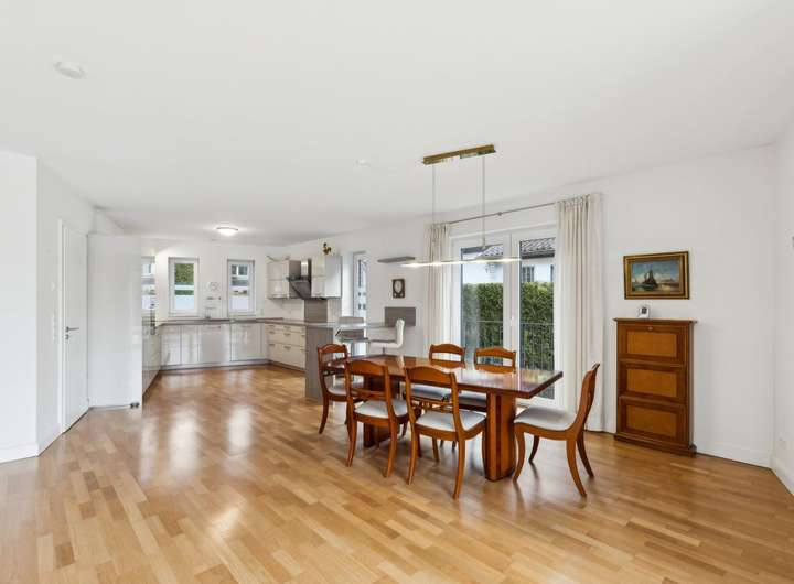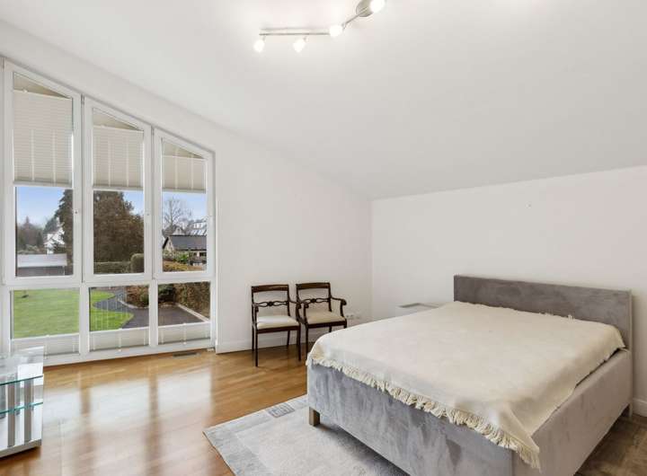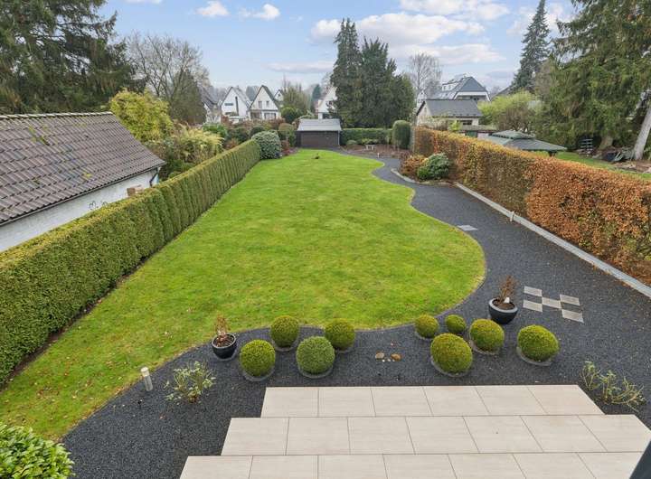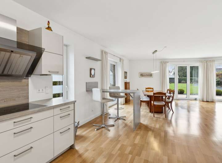 Errichtet wurde die Villa als KfW-Effizienzhaus in ca. 2015, gelegen an einer ruhigen Seitenstraße. Sie präsentiert sich auf einem ca. 1.018 m² großen, süd-westlich ausgerichteten Grundstück. Über die großzügige Diele erreichen Sie die im Parterre liegenden Räume. Der helle Wohn-/Essbereich ist mit hochwertigem Echtholz-Parkett ausgelegt und bildet mit der offenen, in den Raum integrierten Küche das kommunikative Zentrum des Hauses. Die luxuriöse Küche ist hell, zeitlos und modern gehalten. Aus dem Wohnbereich öffnen bodentiefe Fenster den Blick auf die angrenzende Terrasse und den elegant angelegten Garten. Ein schiefersteingefliestes Gäste-WC vervollständigt das Erdgeschoss. Die Deckenhöhe der gesamten Etage beträgt ca. 2,60 m.