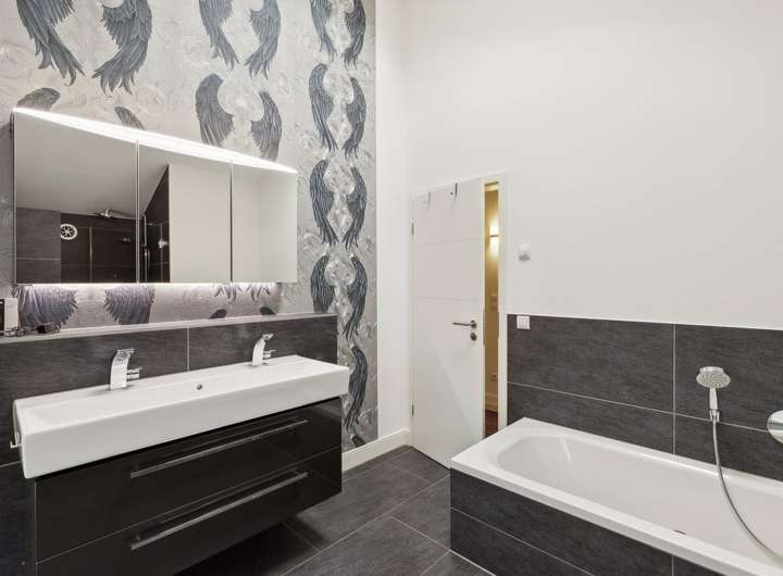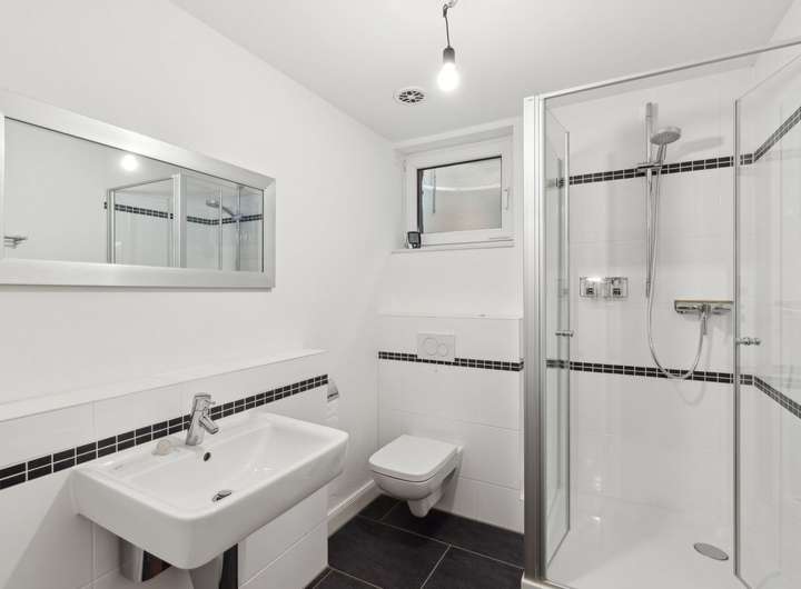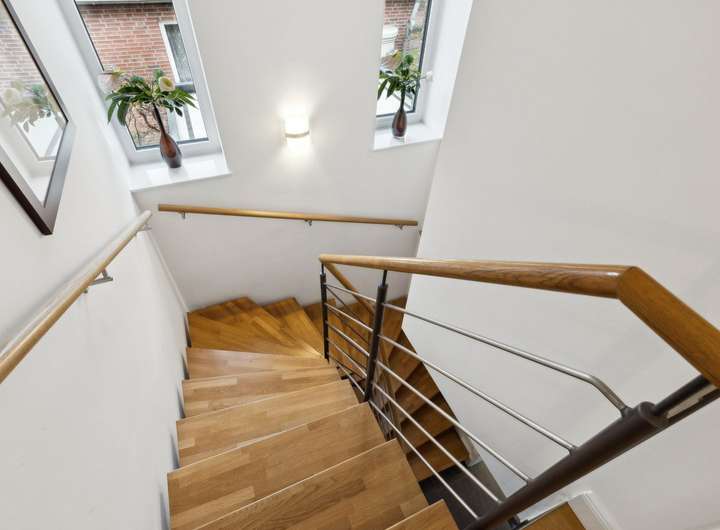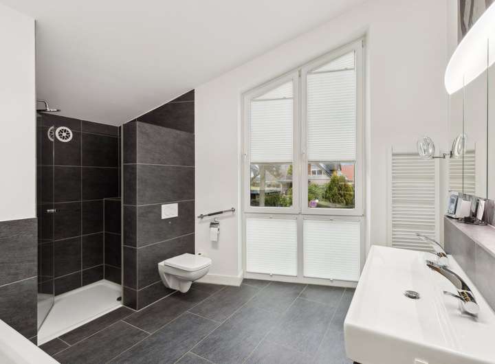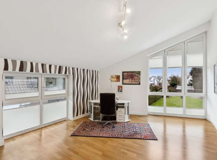 Im Obergeschoss erwarten Sie 3 Zimmer, die mit einer Deckenhöhe von ca. 2 m - 3,50 m variieren, da sie sich in der Spitze bis in den Giebel öffnen. Dies ermöglicht den Einsatz riesiger Fenster, die alle Räume hell und freundlich machen. Durch die große Höhe der Räume bietet sich die Möglichkeit einer Hochebene, die die Einrichtungsmöglichkeit in vieler Hinsicht erweitert. Auch auf dieser Ebene sind die Böden mit Echtholz-Parkett ausgestattet. Das große Badezimmer mit bodentiefer Dusche und Badewanne bietet ausreichend Platz und Komfort. Die Ausstattung ist gehoben und präsentiert sich mit dunklen Granitfliesen zeitlos und modern.