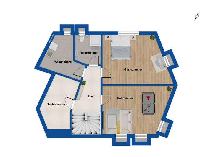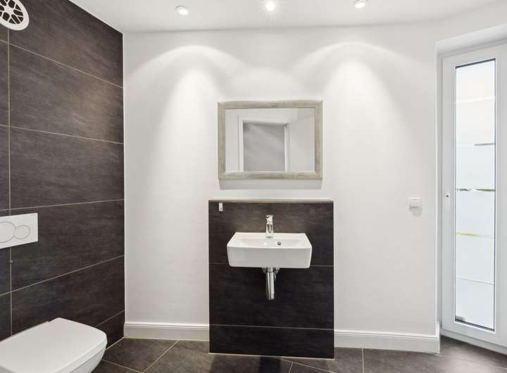 Auch das Souterrain dieser besonderen Immobilie bietet vielerlei Annehmlichkeiten. So ist auch hier die gesamte Etage mit einer Fußbodenheizung ausgestattet. Ein gemütliches Gästezimmer mit großem Fenster und einem vorgelagerten Lichthof und ein zusätzliches Duschbad bieten die Möglichkeit für die Unterbringung von Gästen. Eine Deckenhöhe von ca. 2,40 m und eine gehobene Ausstattung machen die Räume ohne Abstriche als Wohnraum nutzbar. Darüber hinaus befindet sich im Untergeschoss ein weiterer Raum, der als Hobby- oder Fitnessraum genutzt werden kann. Der Technikraum und ein Hauswirtschaftsraum mit Anschlüssen für Waschmaschine und Trockner sind ebenfalls hier untergebracht.
