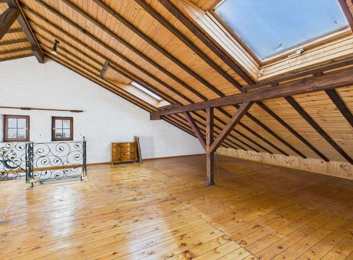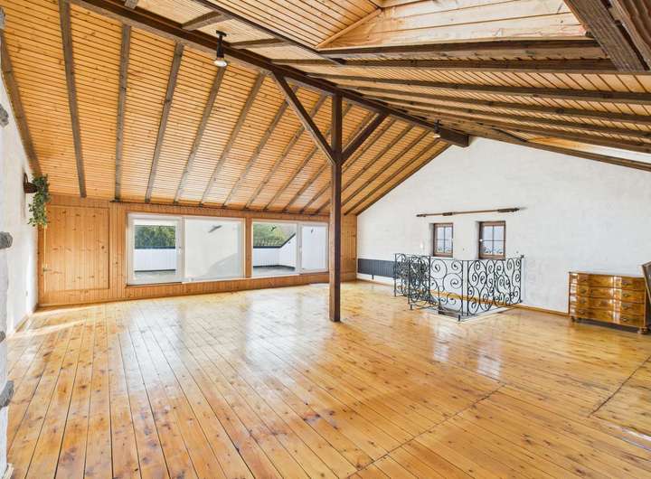 Ein besonderes Highlight ist das ausgebaute Dachgeschoss: Hier erwartet Sie ein beeindruckend großer, offener Raum mit stilvoller Holzvertäfelung, imposanter Deckenhöhe und einer Galerieoptik, die dem Bereich einzigartigen Charakter verleiht. Durch die großen Fensterfronten wirkt der Raum lichtdurchflutet und bietet direkten Zugang zu einer weiteren Dachterrasse. Dieser Bereich eignet sich hervorragend als großzügiges Schlafzimmer, Atelier oder kreativer Rückzugsort – ein Raum mit außergewöhnlichem Flair.