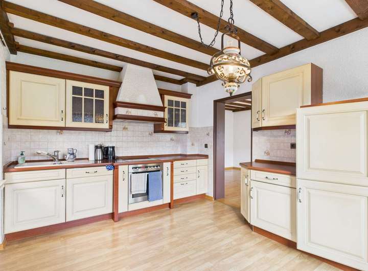 Auch die Küche zeigt sich im klassischen Landhausstil. Die gepflegte Einbauküche mit ihren warmen Farbtönen, dekorativen Fronten und dem großzügigen Fensterbereich fügt sich harmonisch in das Gesamtbild ein.