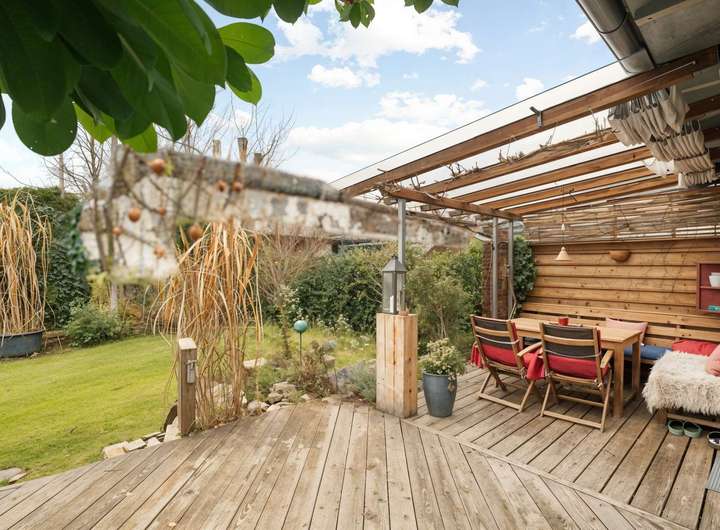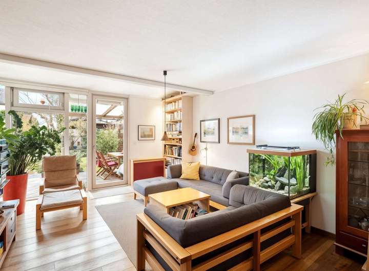 Ein besonderes Highlight ist die überdachte Gartenlounge aus Holz, die den Wohnraum nach außen erweitert und zu jeder Jahreszeit einen herrlichen Blick in den liebevoll angelegten Garten ermöglicht. Mehrere gemütliche Sitzplätze und ein idyllischer Seerosenteich, schaffen eine entspannte Wohlfühlatmosphäre und laden zum Verweilen ein.