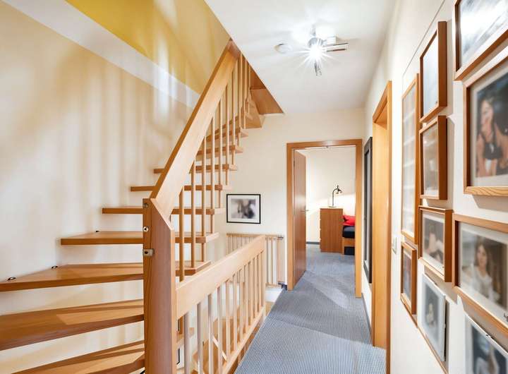 Über eine Holztreppe gelangen Sie in das 1. Obergeschoss, das mit zwei gut geschnittenen Schlafzimmern sowie einem Badezimmer mit Badewanne und Dusche ausgestattet ist.