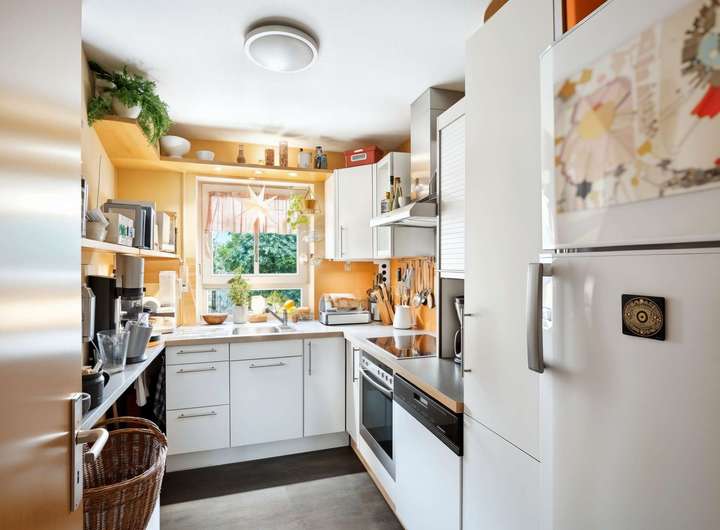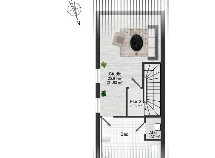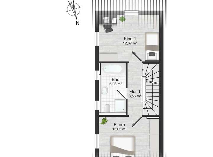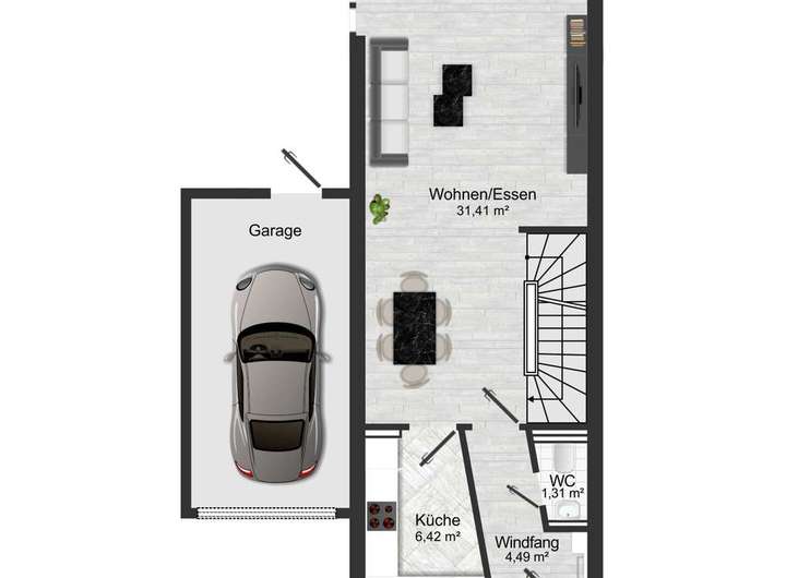 Der ebenerdige Hauseingang führt in einen einladenden Wohnbereich mit klarer Raumstruktur. Eine separate Küche sowie ein Gäste-WC komplettieren das Erdgeschoss.