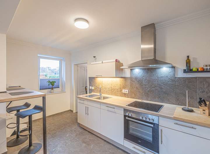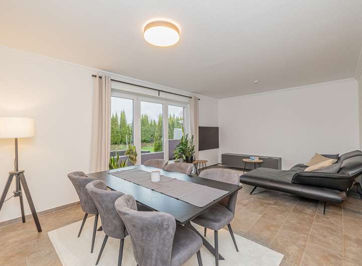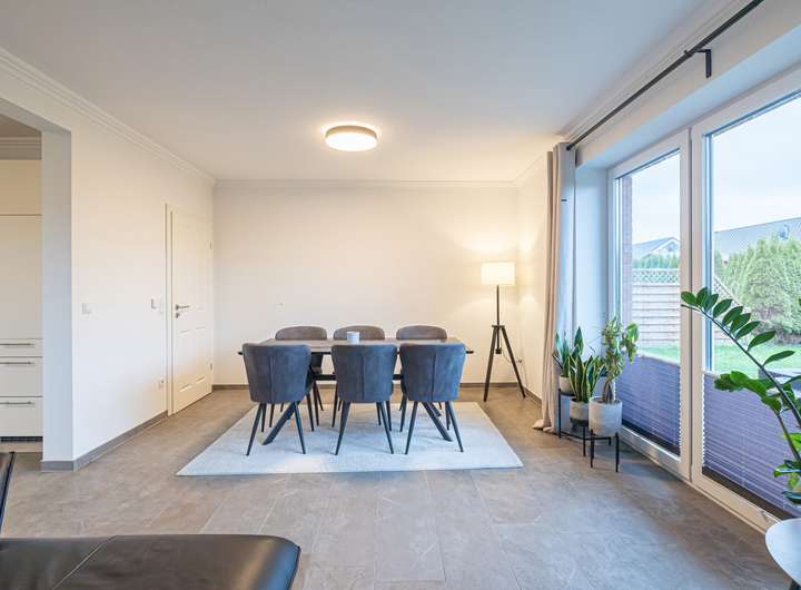 Der Wohn- und Essbereich bildet das Herzstück des Hauses. Großzügig gestaltet, öffnet er sich zur sonnigen Terrasse und in den eingefriedeten Garten. Die integrierte Küche fügt sich harmonisch ein und bildet das Zentrum des gemeinsamen Lebens. Der angrenzende Hauswirtschaftsraum beinhaltet neben der Technik auch reichlich praktischen Stauraum.
