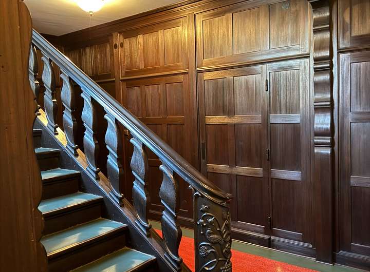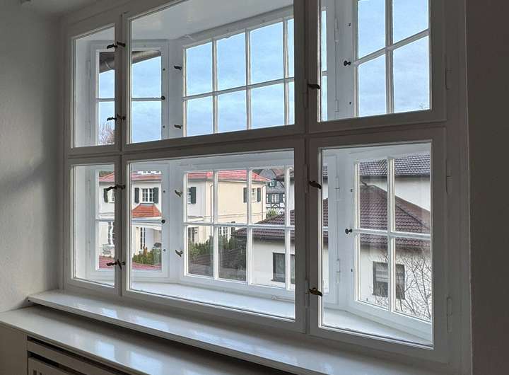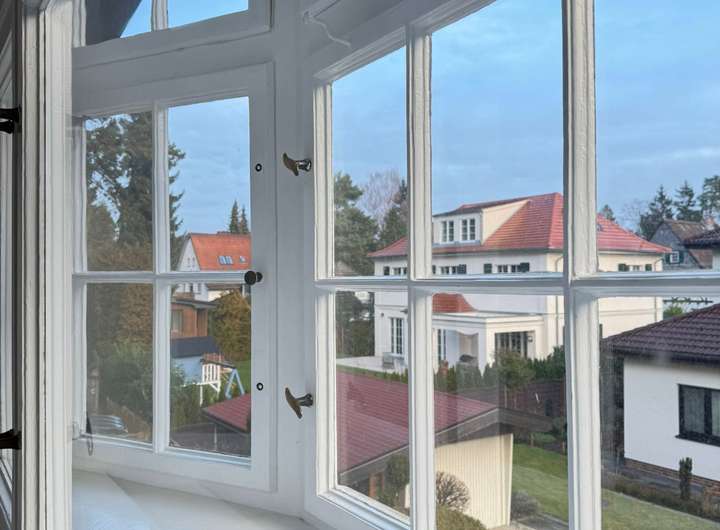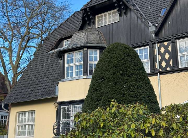 Besonders prägend sind die liebevoll erhaltenen Fachwerkdetails im oberen Fassadenbereich, die steilen, weit auskragenden Satteldächer sowie die klassisch gegliederten Sprossenfenster. Die harmonische Verbindung von verputztem Massivbau und dekorativen Holzelementen verleiht dem Gebäude einen repräsentativen, nahezu herrschaftlichen Charakter und unterstreicht den hohen architektonischen sowie denkmalpflegerischen Wert dieser außergewöhnlichen Villa.