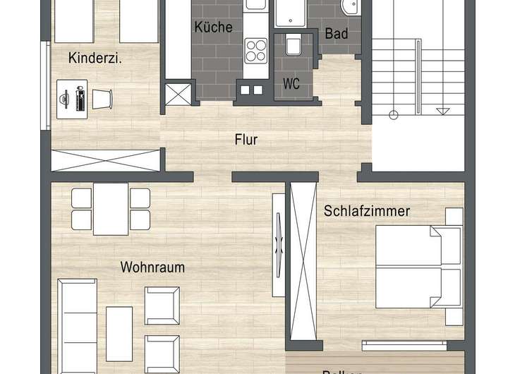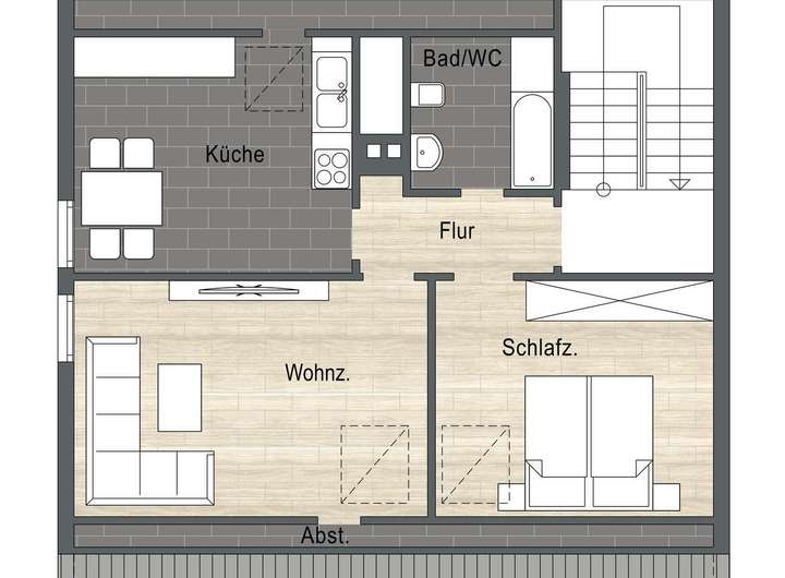 Das Gebäude besteht aus 2 gleich geschnittenen 3,5 Zimmer-Wohnungen und einer 2 Zimmer-Wohnung im DG.