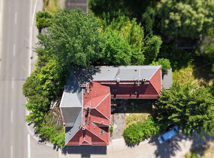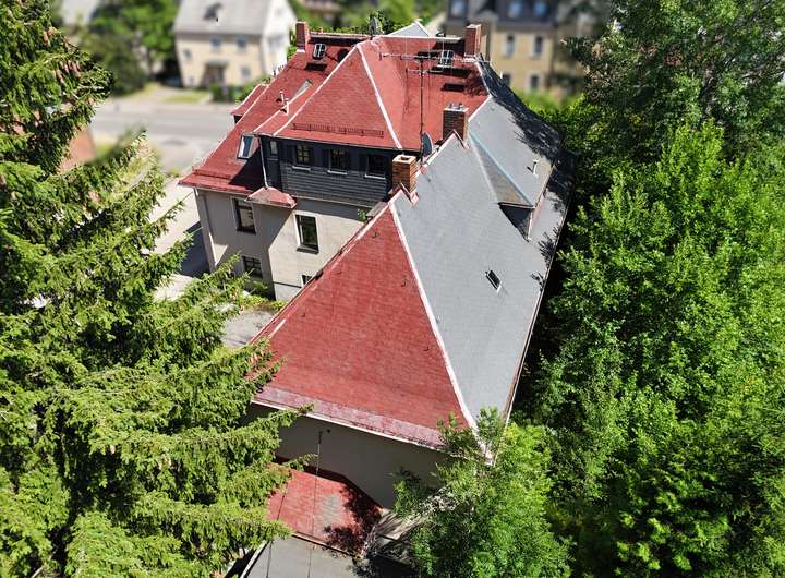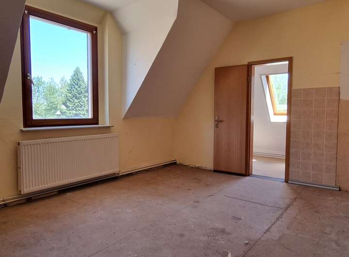 Der linke Teil beinhaltet 2 große Wohnungen (eine je Etage), ist vollunterkellert und verfügt über einen derzeit noch unausgebauten Dachboden.