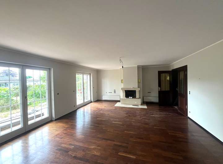 Vom Empfangsbereich gelangen Sie in den wunderschönen Wohnbereich mit offenem Kamin und Zugang zu der nach Süden ausgerichteten Terrasse und weiter in den Garten.