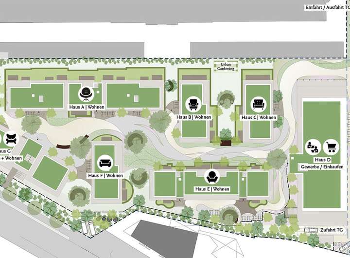 Alters- und familiengerecht – alle Wohnungen sind vom autofreien Innenhof oder über die Tiefgarage stufenlos erreichbar. Geschäfte des täglichen Bedarfs sind nur