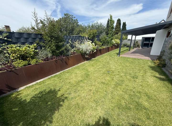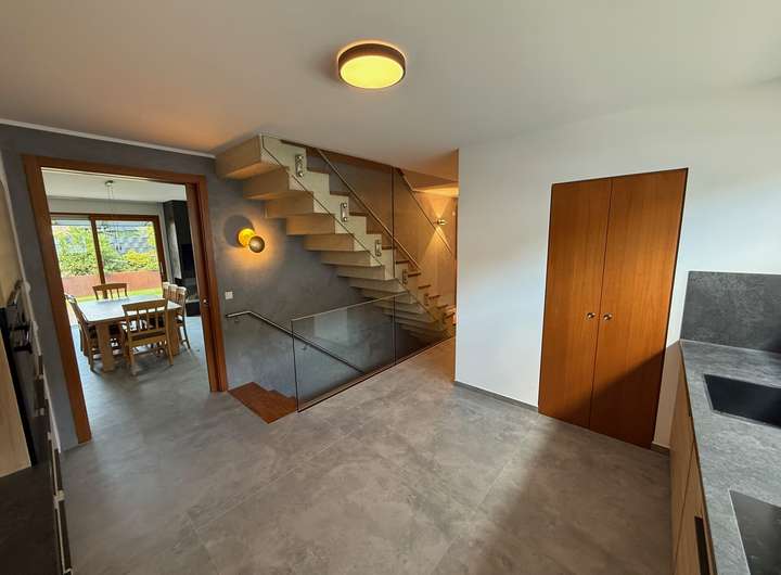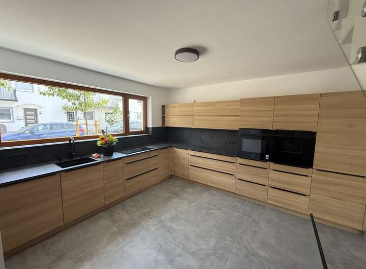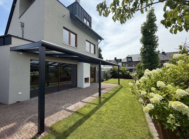 Die hochwertigen Parkett- und Fliesenböden sowie die vom Schreiner gefertigte Einbauküche mit Quooker (Möbelserie Team 7) unterstreichen die Qualität des Hauses. Eine Terrassenüberdachung rundet das Gesamtbild ab.