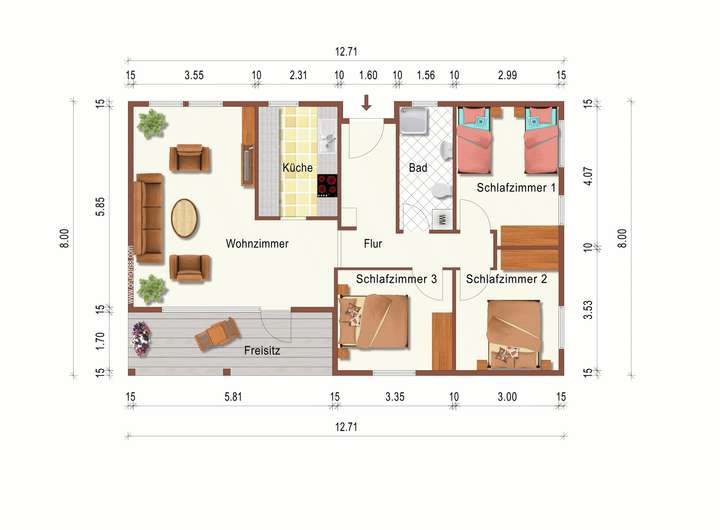 Die ca. 90 qm Wohnfläche beinhalten 3 Schlafzimmer, so dass auch Platz für eine Familie gegeben ist.