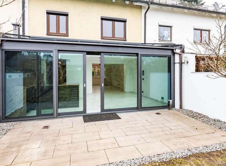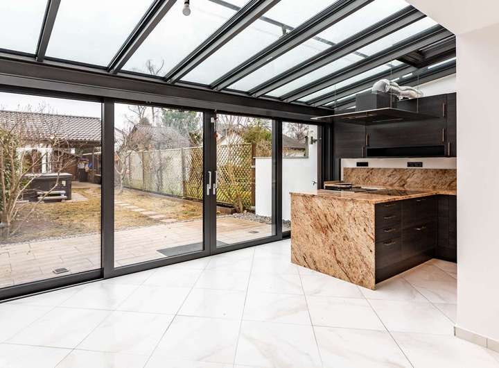 Zukünftiger Lieblingsort in dem geschmackvoll sanierten Familienhaus ist sicher der große - südseitig ausgerichtete - Wintergarten mit Blick in den eigenen Garten und den offenen Küchenbereich.