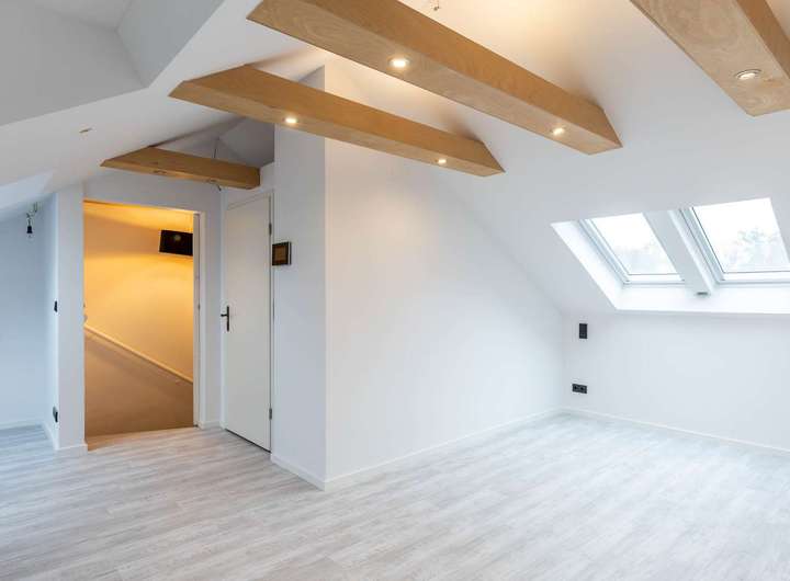 Im Dachgeschoss gibt es ein anheimelndes Studio mit genug Platz für einen ruhigen Home Office Bereich sowie ein gemütliches Schlafzimmer. Sichtbare Holzbalken, eingebaute Deckenstrahler und große Dachflächenfenster tragen viel zur angenehmen Atmosphäre bei. Die im Grundriss gezeigten Gauben sind nicht ausgeführt.