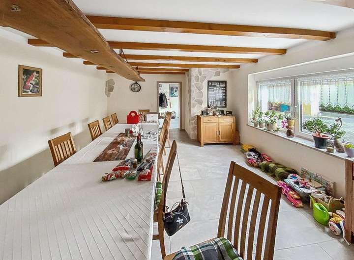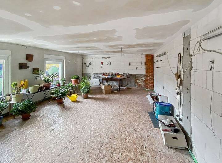 Die Räumlichkeiten sind sehr groß, da wären der Partyraum mit integriertem Back-/ Pizzaofen mit einer langen Tafel, der Sport-/ Fitnessraum, die Männerhöhle, das Nebengebäude mit vielen Abstellmöglichkeiten, die Garage, ein Raum für die Kleintier- bzw. Kaninchenhaltung mit Buchten (inklusive Ablaufrinne), diverses Dämm- und Baumaterial und ein großer Carport für die Autos.