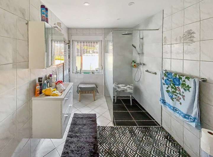 Es gibt zwei Terrassen, eine für das Erdgeschoss und eine im Obergeschoss. Ein großzügiger Raum über dem Anbau kann noch selbst gestaltet werden, derzeit sind es zwei Räume mit ca. 100 m². Im Obergeschoss ist das Bad mit einer ebenerdigen Dusche ausgestattet. Im Erdgeschoss befindet sich das Bad mit einer großen Wanne sowie ein Gäste-WC.