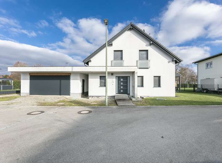 Ergänzt wird dieses attraktive Angebot durch eine nebenliegende Doppelgarage mit viel Platz für zwei Fahrzeuge sowie eine integrierte Werkstatt. Ein überdachter Gang ermöglicht einen komfortablen, wettergeschützten Zugang direkt vom Haus zur Garage.