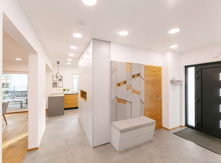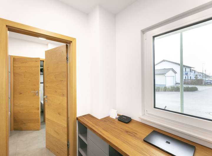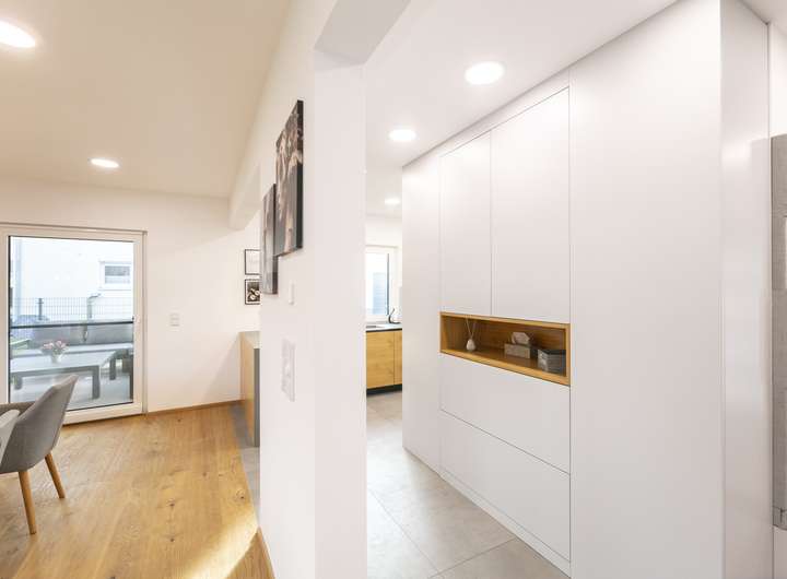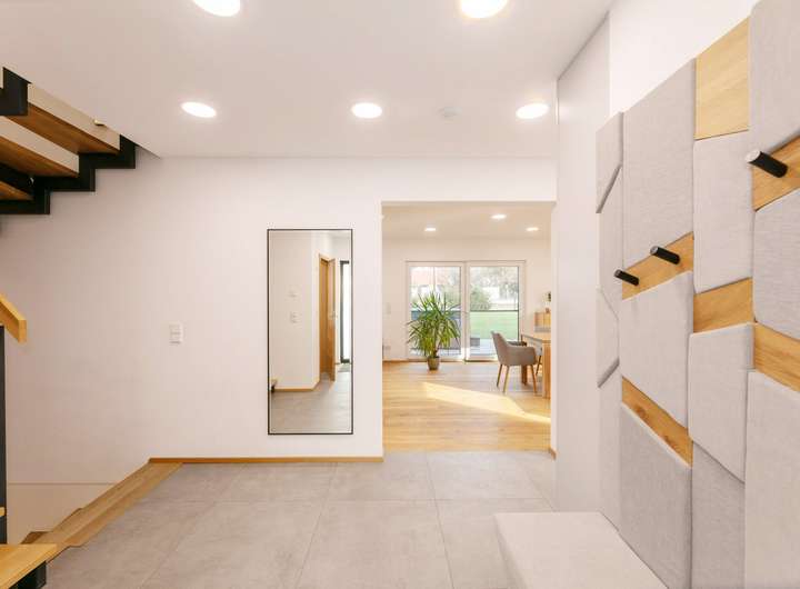 Dieses moderne Einfamilienhaus aus dem Baujahr 2017 präsentiert sich auf einem großzügigen Grundstück von 694 m² und bietet mit einer Wohnfläche von rund 138,27 m² ein stilvolles, hochwertiges Wohnambiente für die ganze Familie. Bereits der Eingangsbereich überzeugt durch eine moderne Gestaltung mit maßgefertigten Einbauschränken und einem klaren, zeitgemäßen Design. Auf dieser Ebene befinden sich zudem ein helles Arbeitszimmer sowie ein Gäste-Bad mit Dusche – ideal für Homeoffice oder Besucher.