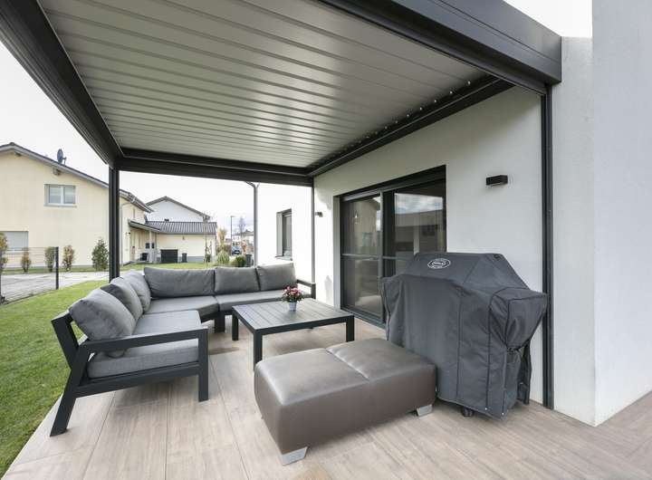 Zur Verdunkelung dienen elektrische Rollläden an den Fenstern und zur Verschattung auf der Terrasse eine hochwertige Pergola.
