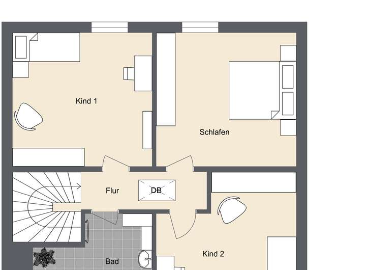 Im Dachgeschoss erwarten Sie ein gemütliches Schlafzimmer sowie zwei helle Kinderzimmer – alle ausgestattet mit bodentiefen Fenstern, die viel natürliches Licht in die Räume lassen. Das stilvolle Badezimmer mit freistehender Badewanne, maßangefertigter Waschtisch und hochwertigen Einbauschränken bietet einen luxuriösen Rückzugsort für erholsame Stunden. Über eine Einschubtreppe im Flur erreichen Sie den Dachspitz, der zusätzlichen Stauraum bietet.