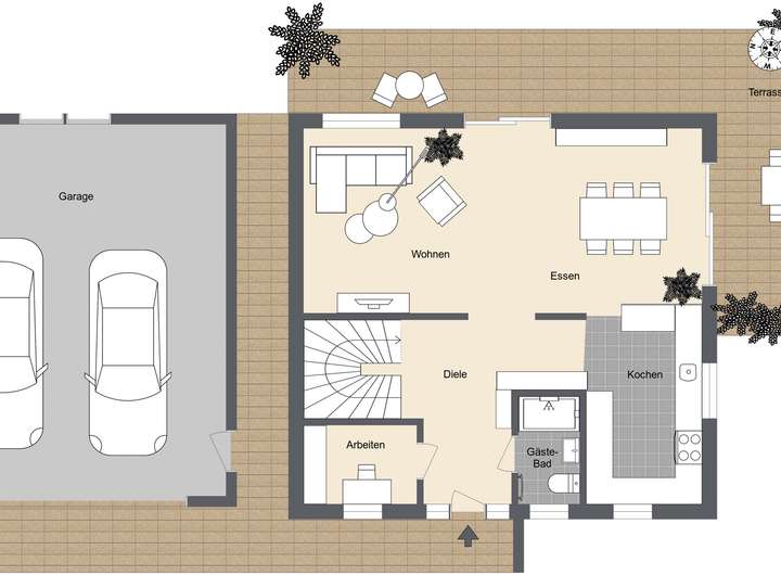 Auf Wunsch wird von den Verkäufern der Außenbereich vor der Garage sowie der Hauseingangsbereich gegen Aufpreis noch fertiggestellt.
