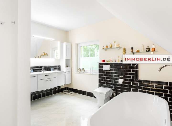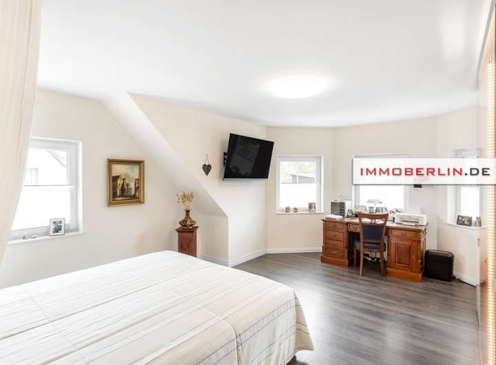 Beachtenswert behaglich ist auch das Obergeschoss, das mit drei wohnlichen Zimmern und einem großen, taghellen Luxusbad im exquisiten Fliesenkleid mit freistehender Wanne begeistert. Attraktiv sind u.a. die geräumige Diele und das große Zimmer, das sich als schöner Schlaf-, Wohn-, Arbeits-, Spiel- und/oder Hobbybereich mit drei zusätzlichen Fenstern im oberen Teil des Standerkers präsentiert.
