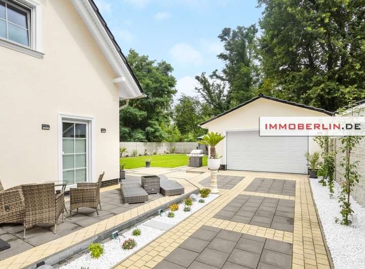 Dieses herrliche Grundstück wird von einer stilvollen Zaunanlage aus dem Jahr 2023 vollständig eingefriedet. Außerdem stehen ein Gartenpavillon sowie eine massiv gebaute und tagesbelichtete Doppelgarage zur Verfügung. Die ansprechend gepflasterte Auffahrt bietet zudem zusätzliche PKW-Stellplätze. Die Torzufahrt wie auch das Garagentor lassen sich elektrisch bedienen.