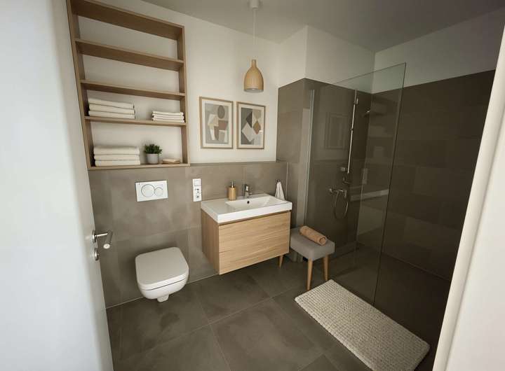 Die 2-Zimmer-Wohnung vereint moderne Architektur mit dem historischen Charakter des Ortes. Großzügige Fensterfronten lassen viel Tageslicht herein und schaffen eine helle, freundliche Atmosphäre. Die sorgfältige Auswahl hochwertiger Materialien sowie die elegante Ausstattung verleihen der Wohnung ein stilvolles Ambiente, das den besonderen Geist des Rheingaus widerspiegelt.