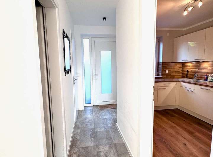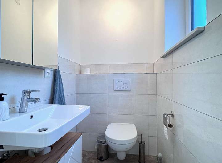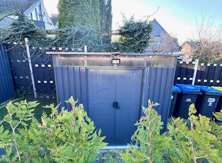 Im Außenbereich befindet sich ein Außenstellplatz, auf dem Sie Ihr Auto parken können. Ein zusätzlicher Abstellraum bietet Platz für Fahrräder oder Gartengeräte. Für den täglichen Komfort verfügt das Haus über ein Gäste-WC und eine moderne Einbauküche, die bereits im Mietpreis enthalten ist.