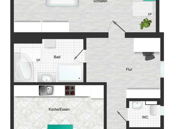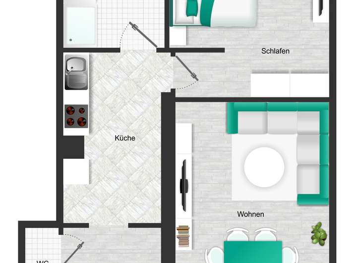 Die visualisierten Grundrisse basieren auf den tatsächlichen Grundrissen und dienen lediglich zur besseren Vorstellung der Räumlichkeiten vor Ort. Eine Garantie für die Richtigkeit der Angaben und Einzeichnungen können wir nicht übernehmen.