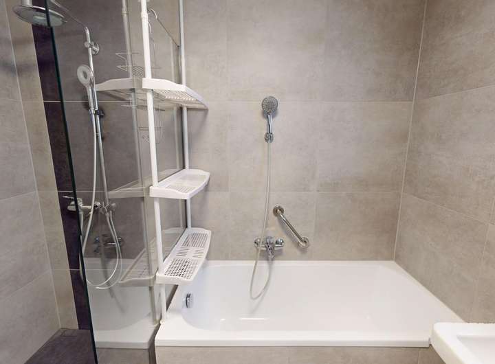 -Tageslichtbad mit begehbarer & gefliester Dusche, Badewanne, Waschbecken,