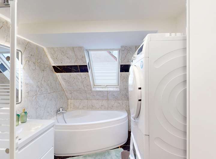 - Tageslichtbad mit Dusche, Eckbadewanne, Waschbecken, Handtuchheizkörper