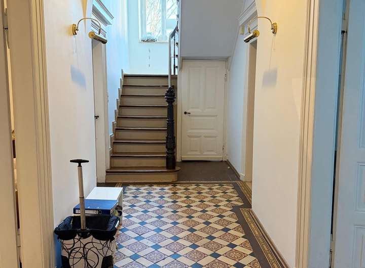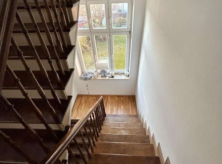 Ob Wohnen mit der Grossfamilie, Arbeiten und Wohnen oder die rein gewerbliche Nutzung - hier ist alles möglich! Die Villa wurde 2002-2024 teilsaniert (Wasser-, Gas- und Elektroleitungen) und das DG komplett neu ausgebaut. Im Erdgeschoss, das über das großzügige Eingangsportal erreichbar ist, gelangen Sie zunächst in die Diele. Von hier gehen linksseitig zwei miteinander verbundene Zimmer ab. Nach rechts gibt es einen kleinen Flur, von dem das Gäste-WC mit Dusche und eine Teeküche abgeht.