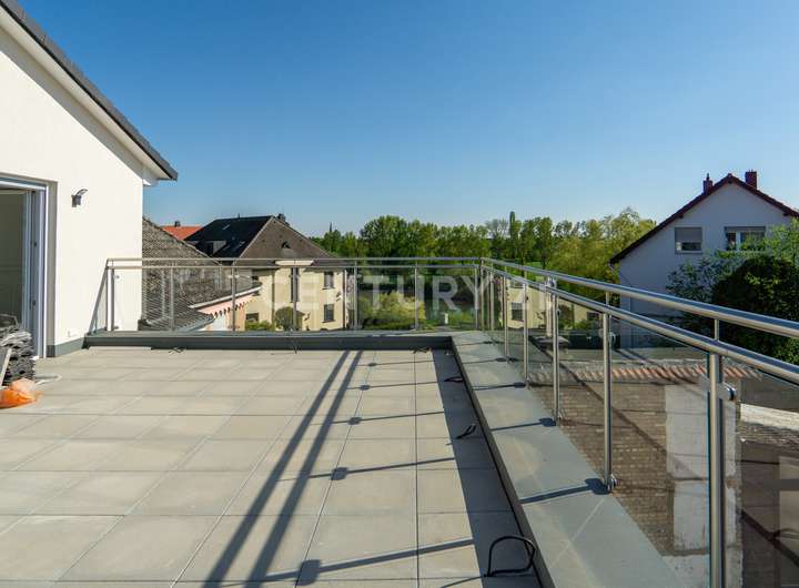 Im Obergeschoss erwarten Sie vier helle Schlafzimmer, ein Badezimmer mit Wanne und Dusche sowie ein separates Duschbad. Über eine elegante Treppe gelangen Sie in das Dachgeschoss, wo sich der offene Wohn- und Essbereich mit integrierter Einbauküche befindet. Von hier haben Sie direkten Zugang zur riesigen Dachterrasse, die mit ihrem einmaligen Neckarblick zu entspannten Abenden und geselligen Runden einlädt. Zusätzlich stehen Ihnen ein Abstellraum sowie ein Gäste-WC auf dieser Ebene zur Verfügung.