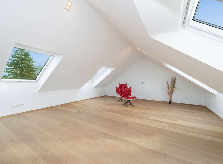 Das Dachgeschoss erweitert das Haus um ein großzügiges Atelier mit über 27m² Fläche. Der offene Charakter, die Lichtführung über mehrere Dachflächenfenster und die klare Geometrie machen diesen Raum vielseitig nutzbar.