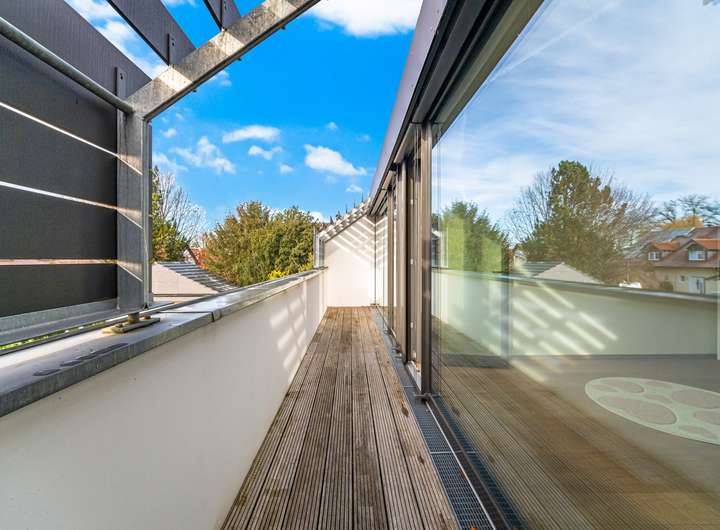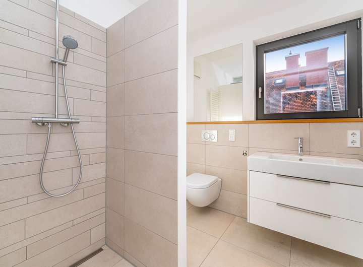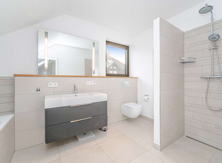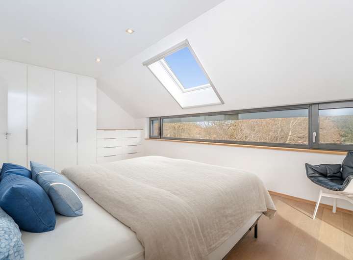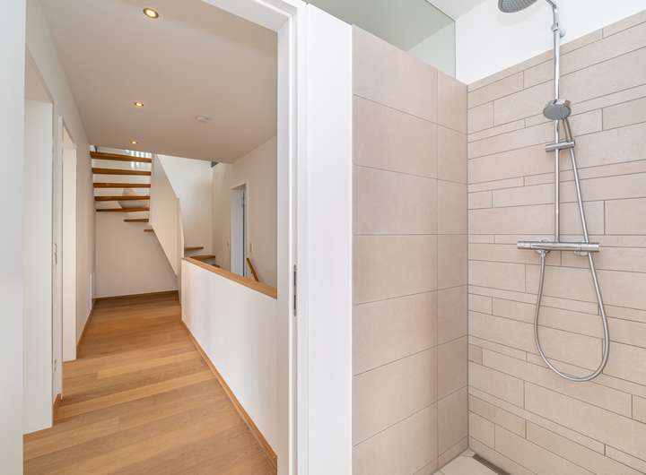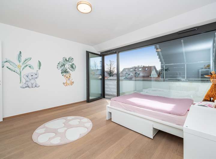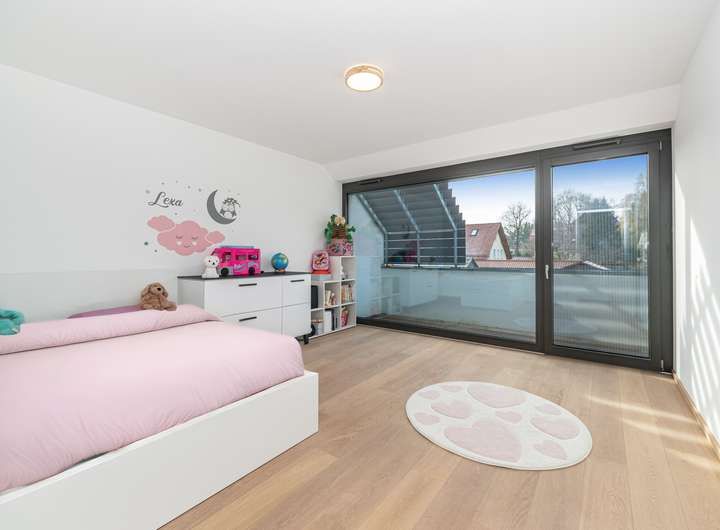 Im Obergeschoss zeigt sich die Struktur des Hauses besonders deutlich: Zwei nahezu identisch geschnittene Kinderzimmer liegen nebeneinander und teilen sich den Balkon. Ein eigenes Duschbad grenzt unmittelbar an. Das Elternschlafzimmer bildet mit langem Fensterband, zusätzlichem Dachflächenfenster und maßgefertigten Einbauschränken eine private Rückzugsebene; das en suite Vollbad ist modern und hochwertig ausgestattet.