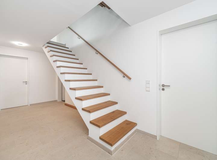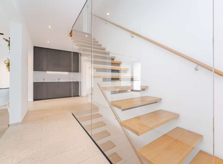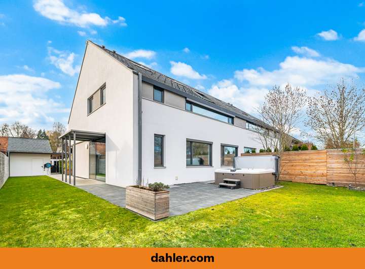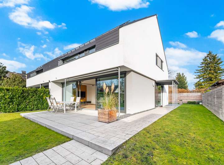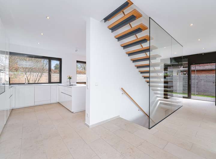 Diese Doppelhaushälfte aus dem Jahr 2017 überzeugt durch eine klare architektonische Handschrift, großzügige Proportionen und eine angenehm ruhige Materialästhetik. Bereits die Eingangssituation wirkt leicht und modern: Ein geschützter Zugang führt in eine helle Diele, in der Naturstein, Eiche und Glas eine hochwertige Grundstimmung schaffen.