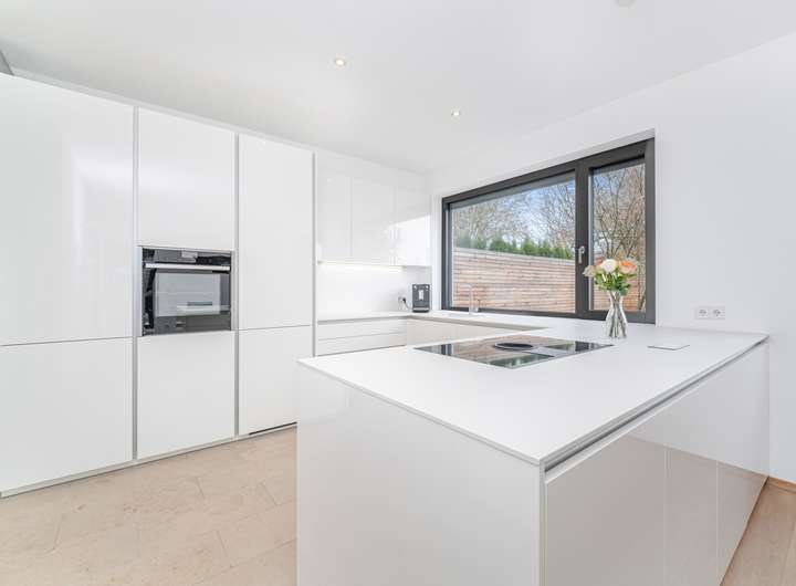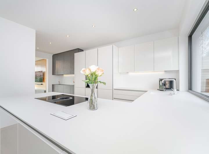 • Einbauküche in zurückhaltendem Weiß mit Acrylfronten in SENSOtec-Qualität (extrem kratzfest, anti-fingerprint)