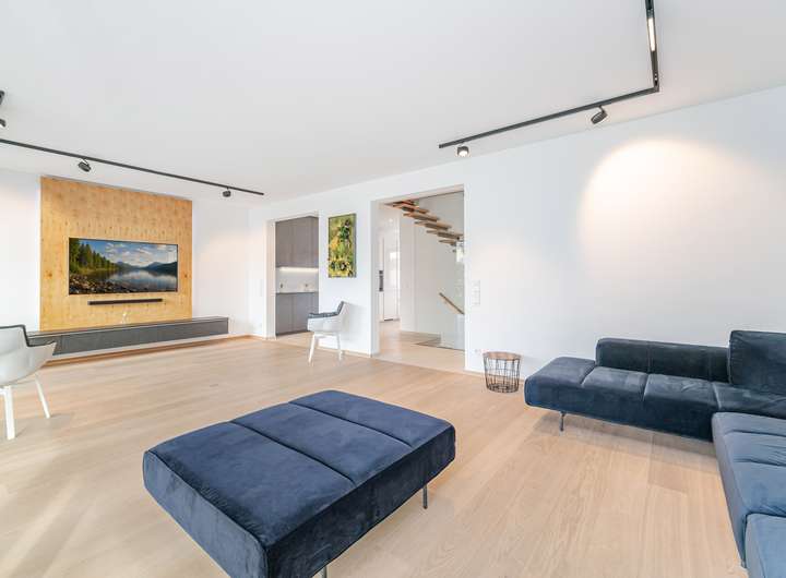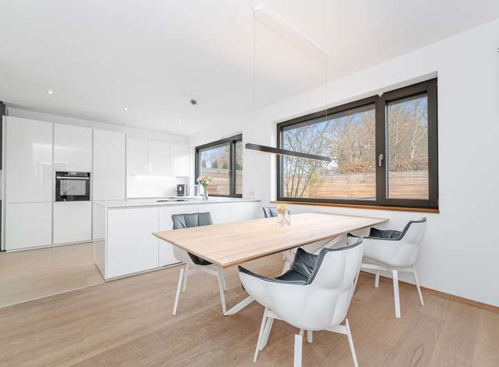 Der Wohnbereich im Erdgeschoss ist als zusammenhängende Raumsequenz gestaltet – Küche, Essen und Wohnen greifen harmonisch ineinander. Die Küche mit ihren weißen Fronten setzt einen feinen Kontrast zum warmen Eichenboden. Der Essbereich bildet das Zentrum und öffnet sich über breite Sichtachsen in mehrere Richtungen. Großformatige Fensterflächen und raumhohe Schiebetüren verbinden den Wohnbereich fließend mit dem Garten. Eine maßgefertigte Holzpaneelwand mit integrierter Medienlösung setzt einen klaren gestalterischen Akzent.