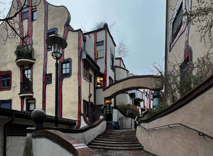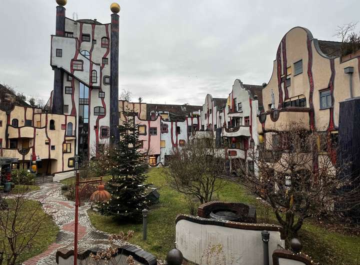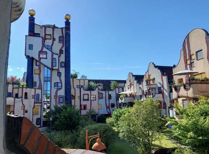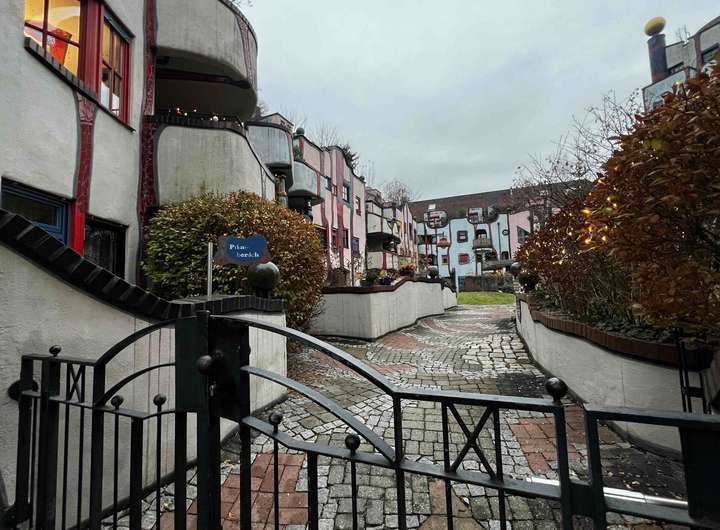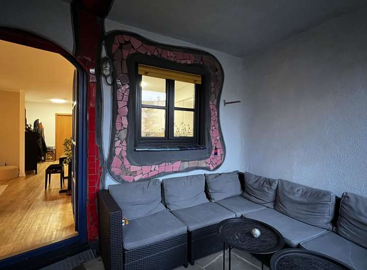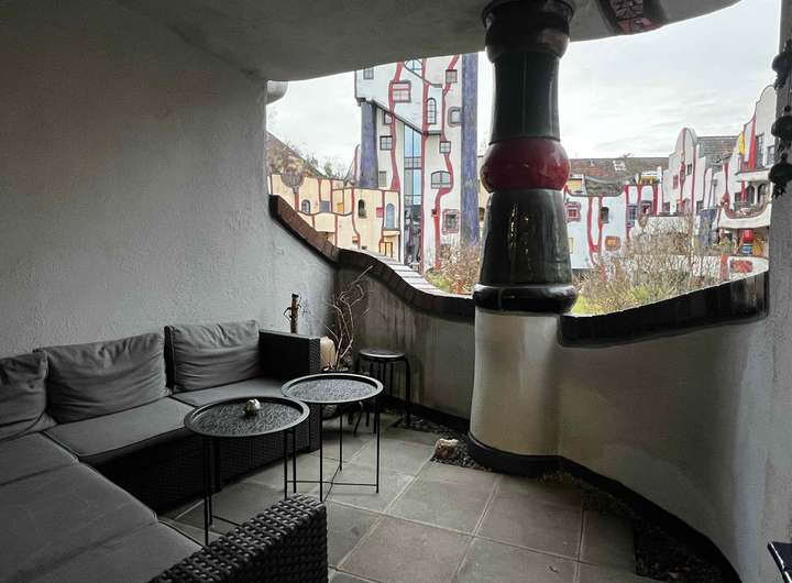 Diese wunderschöne Wohnung im 1. OG des Hundertwasserhauses besticht durch ihren großen überdachten Balkon mit Blick in den von Friedensreich Hundertwasser gestalteten Innenhof: viel Grün, phantasievolle Bepflanzungen, ideenreiche Fassaden, bunte Fenster.