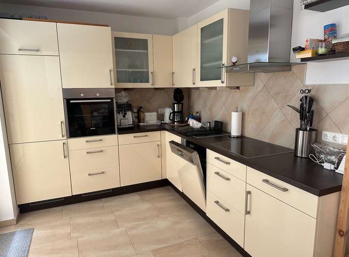 Fußbodenheizung, geflieste Eckdusche, hochwertige Einbauküche, Plissees