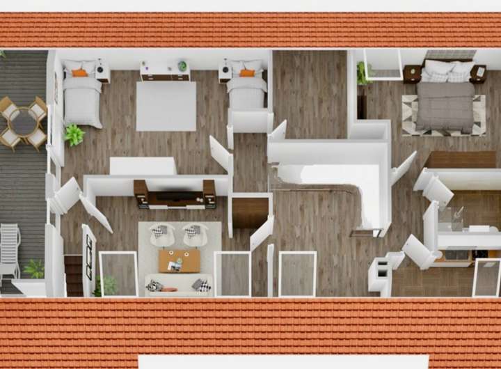 Die vorhandenen Dachschrägen verlaufen längs an beiden Seiten des Hauses und sind hauptsächlich in der Küche spürbar. In den übrigen Räumen fallen sie aufgrund der Raumgrößen kaum ins Gewicht.