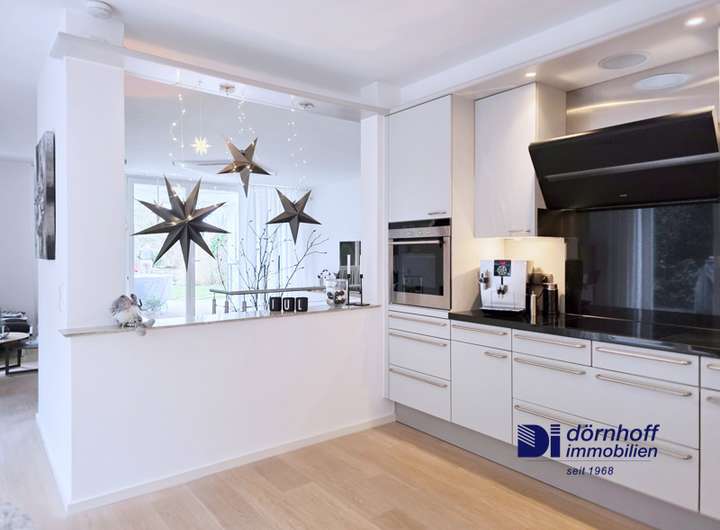 Echtholzböden in allen Wohnräumen im Erdgeschoss, hochwertige Keramikböden im Untergeschoss, moderne Fußbodenheizung, eine bestens ausgestattete Einbauküche (modernisiert), Alarmanlage, Smart-Bewässerungssystem, stilvolle Garten- und Baumbeleuchtung sowie ein Tiefgaragenstellplatz und zusätzliche Außenstellplätze unterstreichen den gehobenen Anspruch dieser Immobilie.