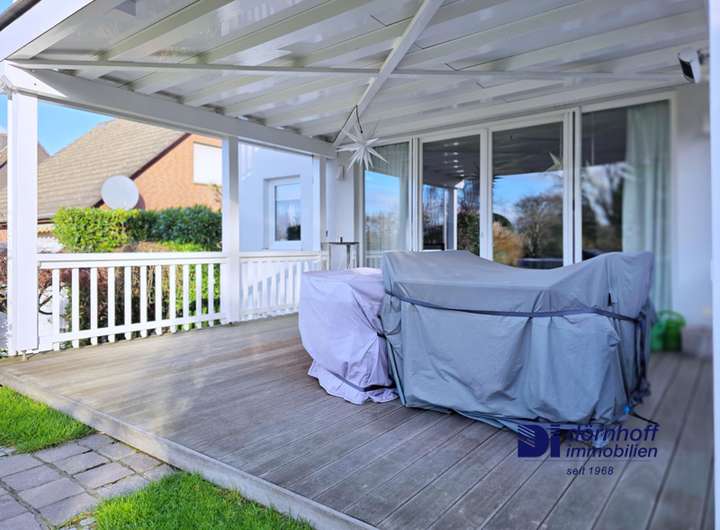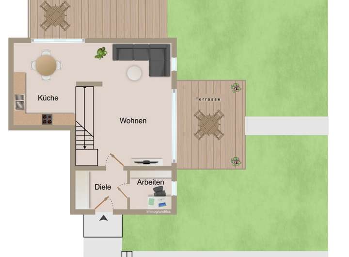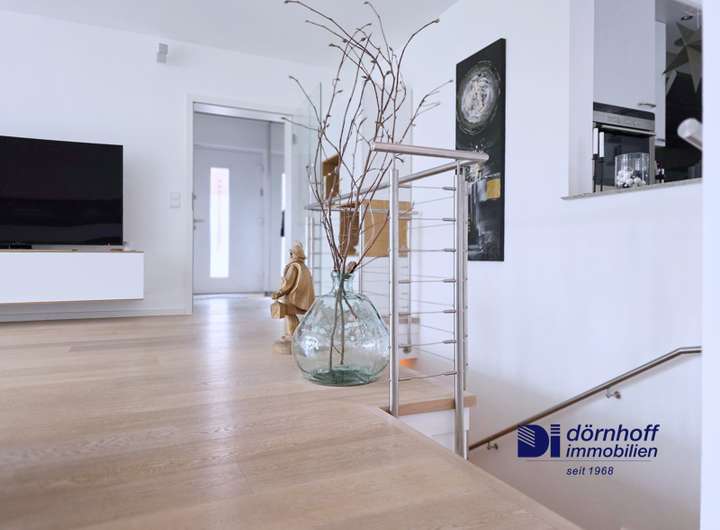 Geradeaus öffnet sich der lichtdurchflutete Wohn- und Essbereich mit offener, moderner Küche. Großzügige Fensterflächen holen den Garten optisch in den Raum und schaffen eine außergewöhnliche Verbindung zwischen Innen- und Außenbereich. Von hier wie auch direkt von der Küche aus gelangen Sie auf die Terrasse – perfekt für fließende Übergänge zwischen Kochen, Wohnen und Entspannen im Freien.
