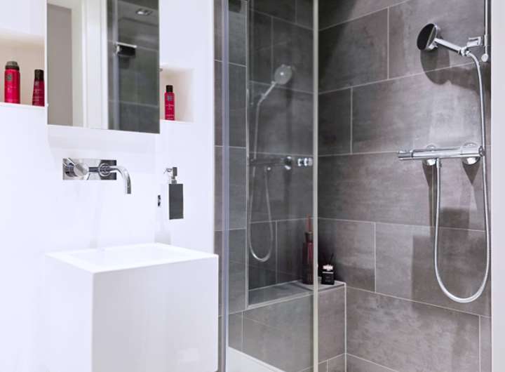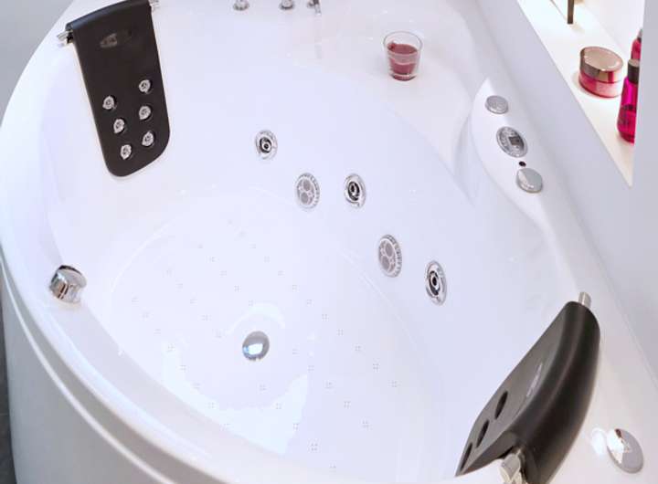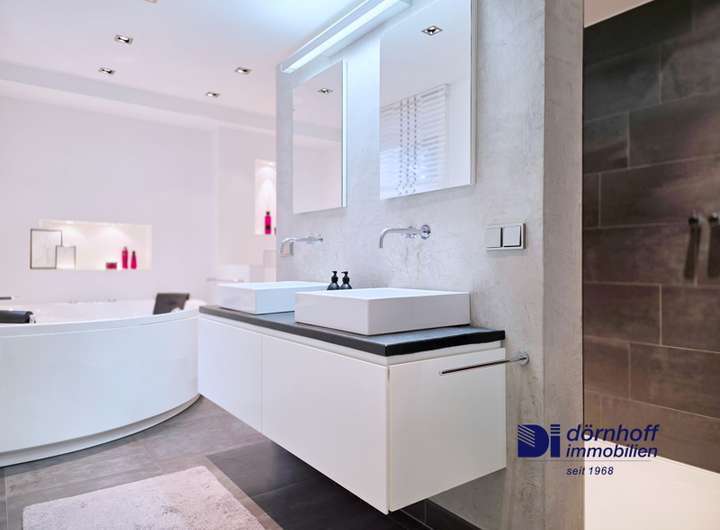 – modernes Badezimmer mit Doppelwaschtisch, Whirlpoolbadewanne, bodengleicher großer Dusche
