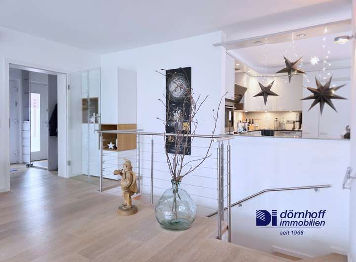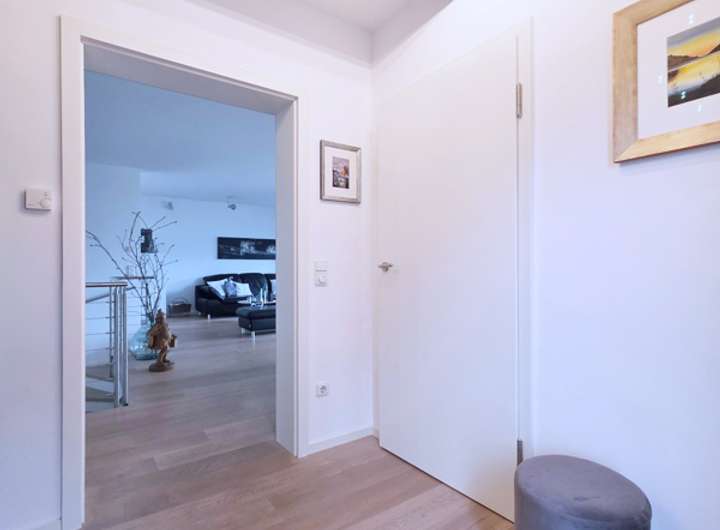 Bereits beim Betreten der Wohnung wird klar: Hier wurde mit Anspruch geplant. Die hochwertige Empfangsdiele erschließt strukturiert und logisch die einzelnen Bereiche. Rechterhand befindet sich ein separates Arbeitszimmer im Erdgeschoss – ideal für konzentriertes Homeoffice, kreative Arbeit oder als ruhiger Rückzugsort abseits des Wohnbereichs.