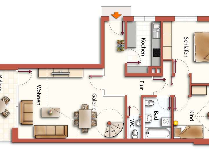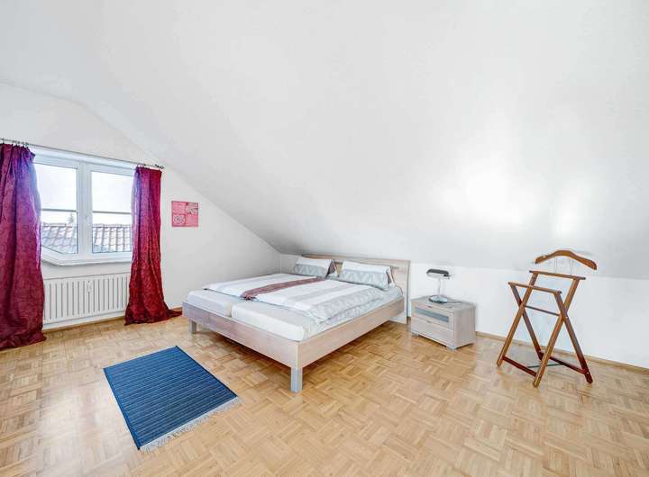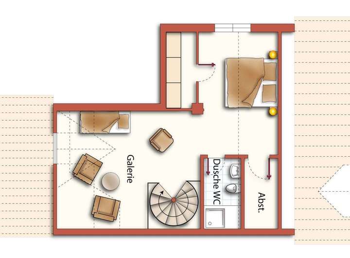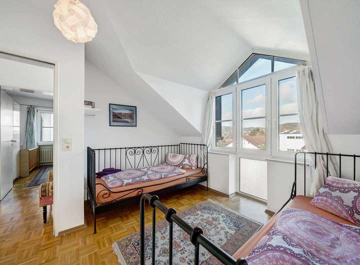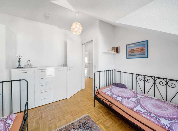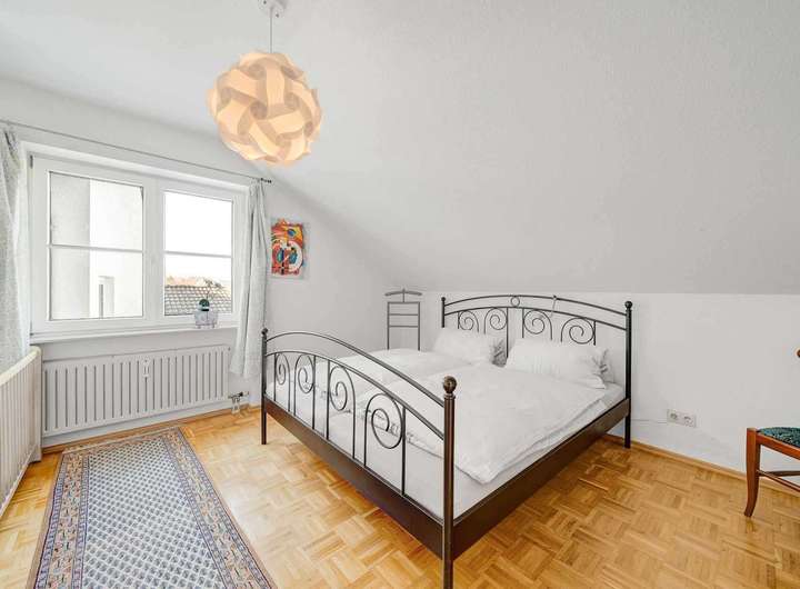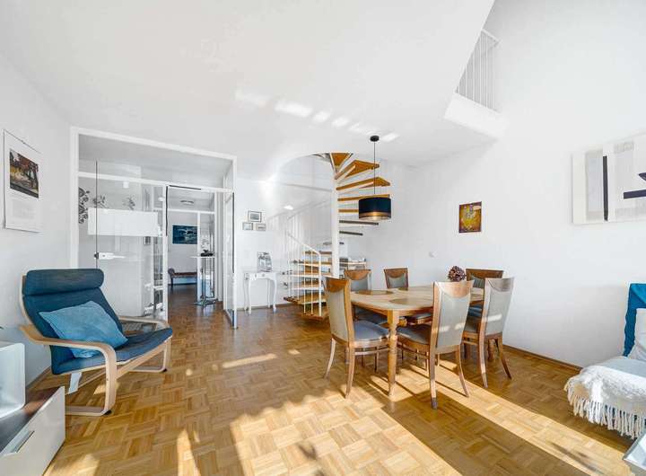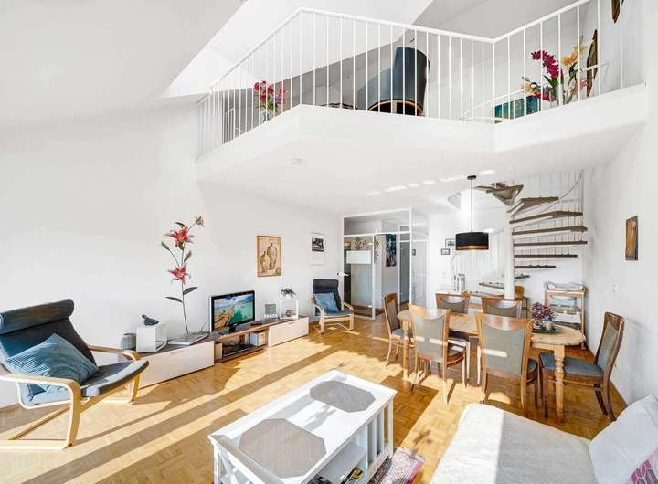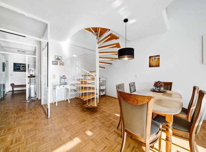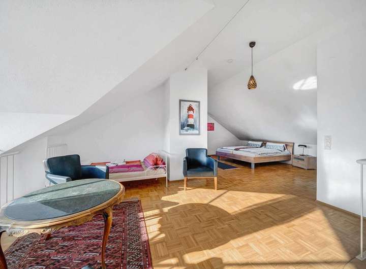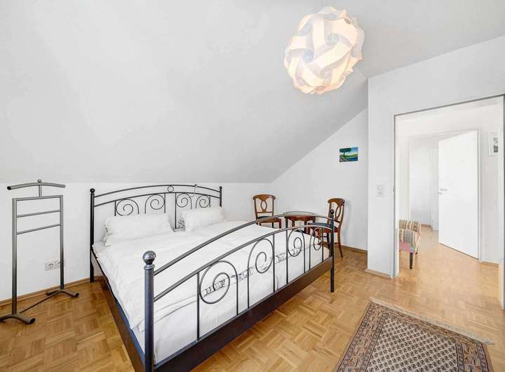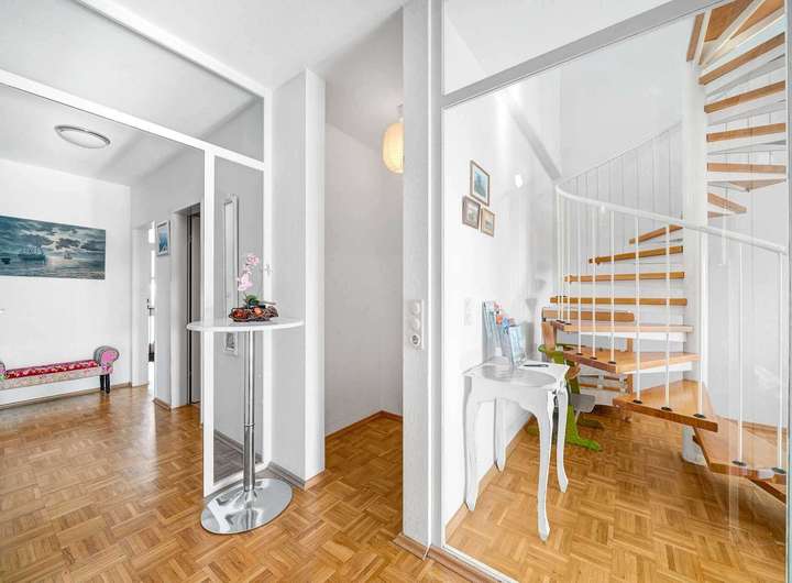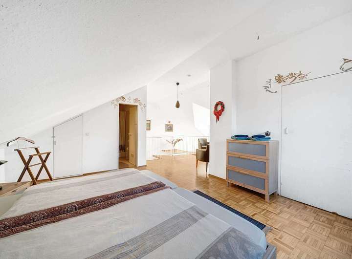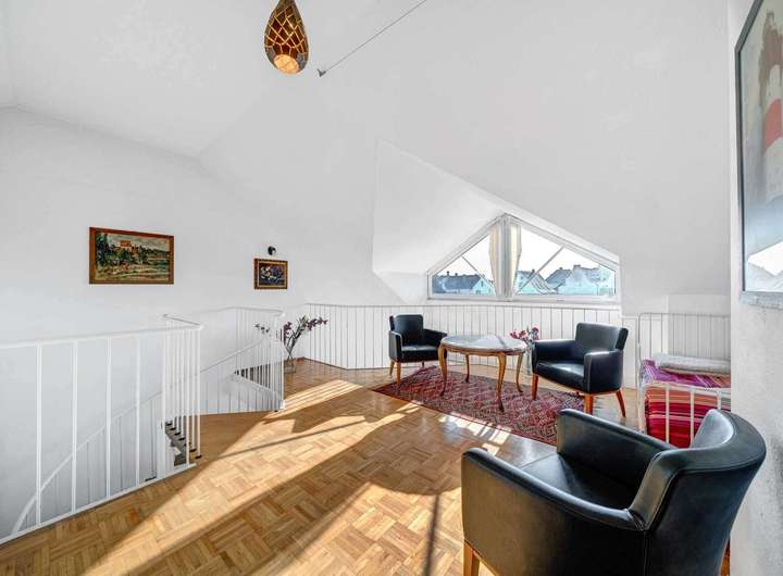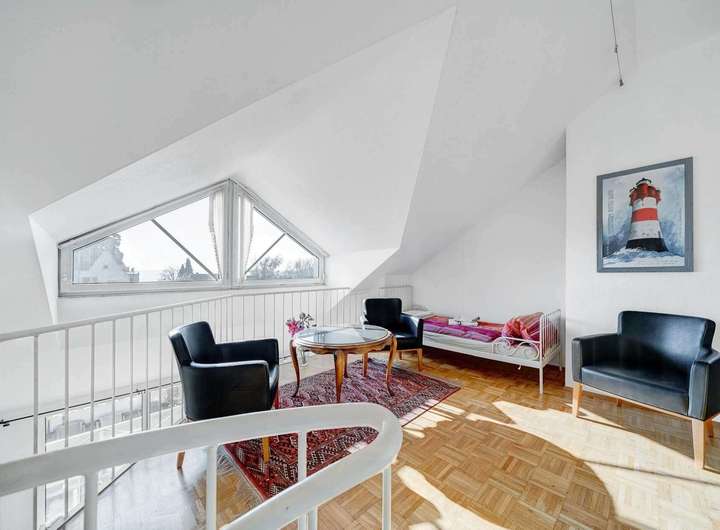 Auf der unteren Ebene befinden sich, neben dem Wohnzimmer, die Küche mit Fenster, zwei Schlafzimmer, ein Badezimmer mit Badewanne sowie ein praktischer Abstellraum und ein Gäste-WC. Über eine stilvolle Wendeltreppe gelangt man in das obere Geschoss mit Galerie, einem weiteren Badezimmer mit Dusche sowie dem großzügigen Schlafzimmer mit Dachschräge und begehbarem Kleiderschrank. Bei Bedarf kann hier mit geringem Aufwand ein zusätzliches, abgeschlossenes Zimmer geschaffen werden.
