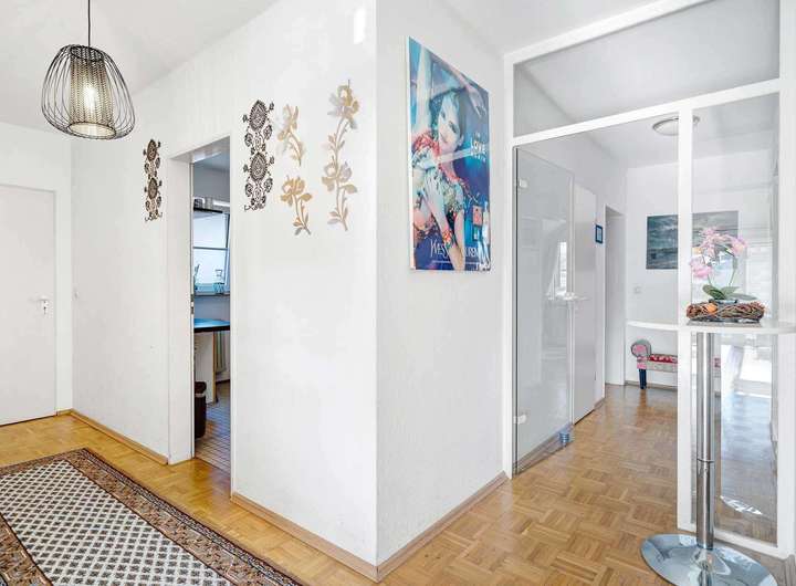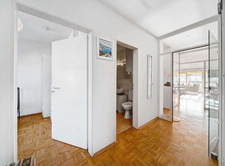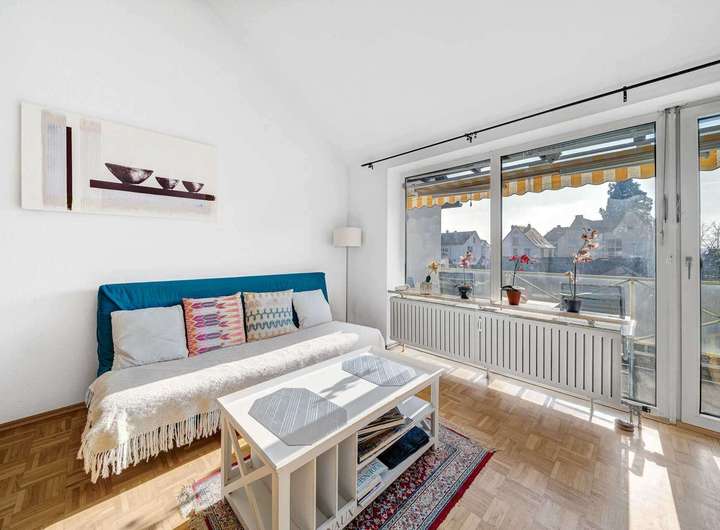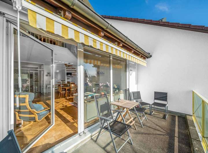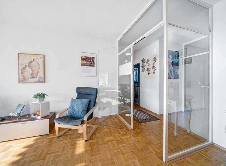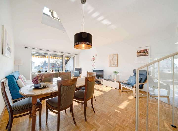 Der großzügige Wohnbereich mit offener Galerie bildet das Herzstück der Wohnung und ist über eine elegante Ganzglastür erreichbar. Große Fensterflächen sorgen für viel Licht und ein angenehmes Raumgefühl. Die angrenzende Loggia ist großzügig geschnitten, zu den Nachbarwohnungen abgetrennt, überdacht und mit Markise ausgestattet. Von hier aus eröffnet sich ein schöner Blick über die Dächer der Stadt.